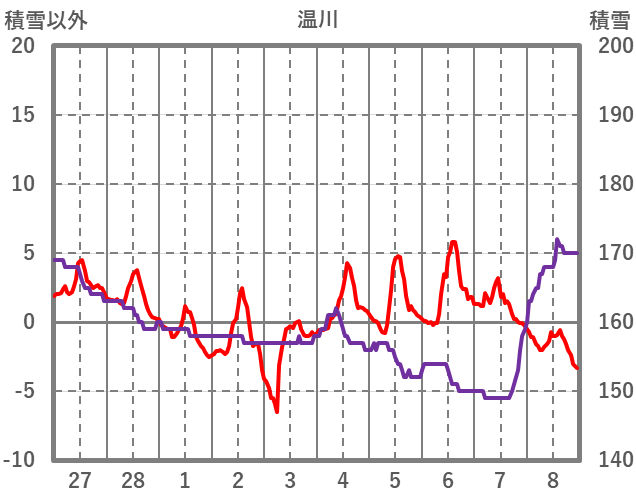| 日 | 時 | 気温 | 降水 | 風向/風速 | 日照 | 積雪 | 降雪 |