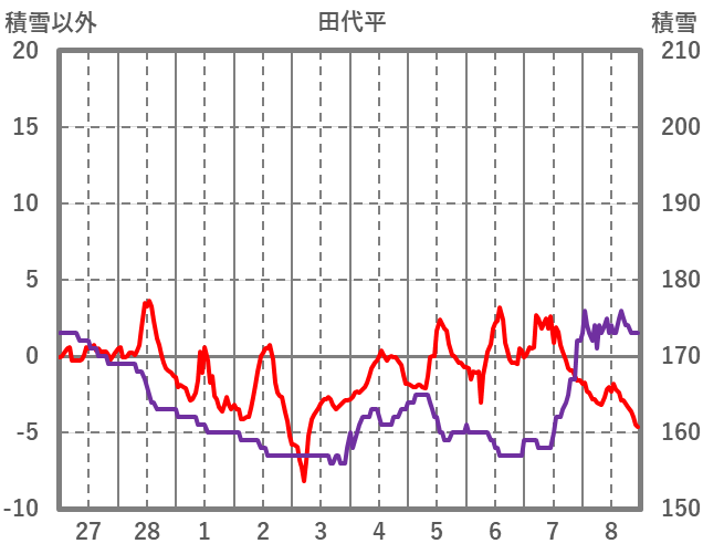 | 日 | 時 | 気温 | 降水 | 風向/風速 | 日照 | 積雪 | 降雪 |