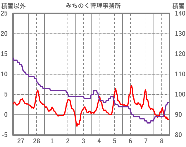 | 日 | 時 | 気温 | 降水 | 風向/風速 | 日照 | 積雪 | 降雪 |