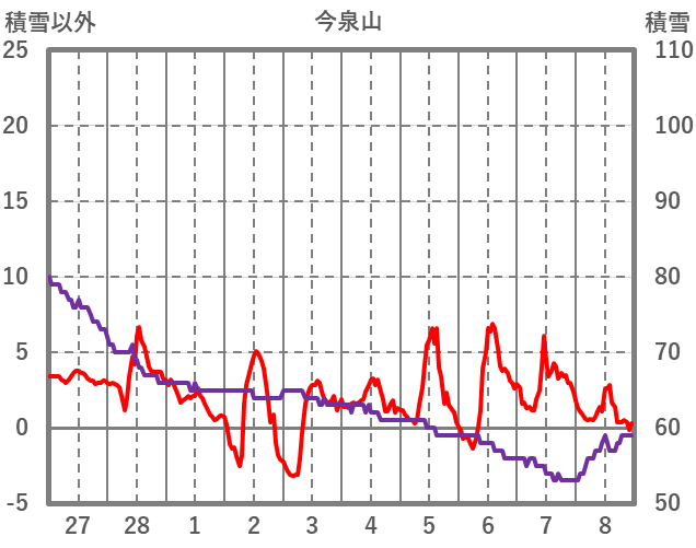| 日 | 時 | 気温 | 降水 | 風向/風速 | 日照 | 積雪 | 降雪 |