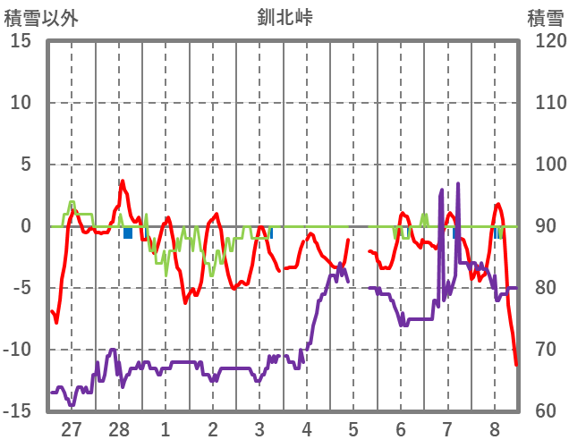 | 日 | 時 | 気温 | 降水 | 風向/風速 | 日照 | 積雪 | 降雪 |