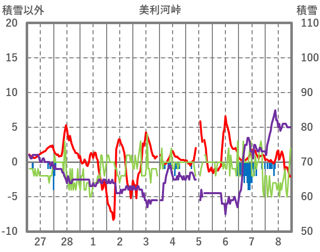 | 日 | 時 | 気温 | 降水 | 風向/風速 | 日照 | 積雪 | 降雪 |