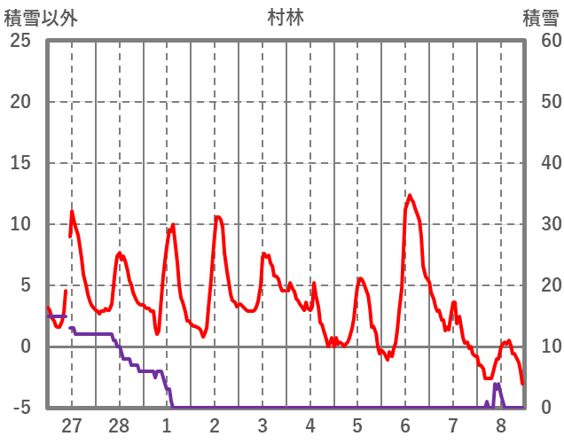 | 日 | 時 | 気温 | 降水 | 風向/風速 | 日照 | 積雪 | 降雪 |