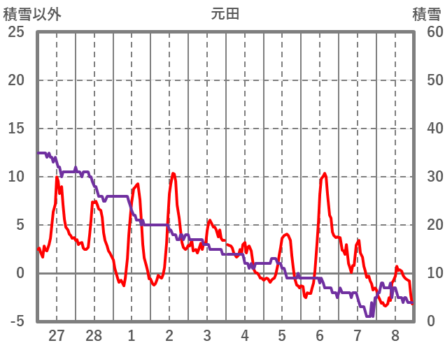 | 日 | 時 | 気温 | 降水 | 風向/風速 | 日照 | 積雪 | 降雪 |