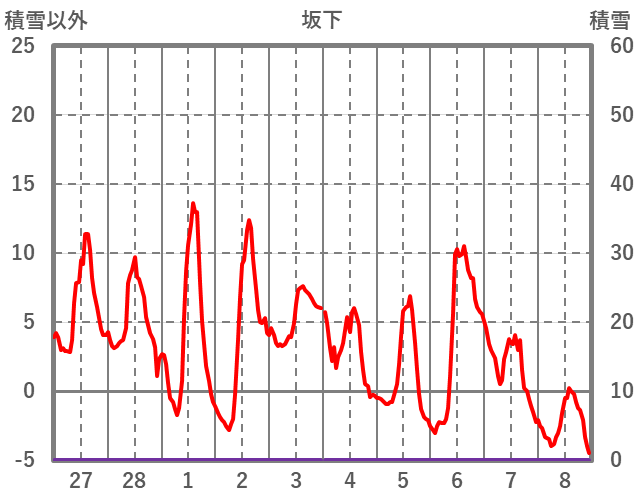| 日 | 時 | 気温 | 降水 | 風向/風速 | 日照 | 積雪 | 降雪 |