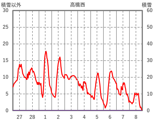 | 日 | 時 | 気温 | 降水 | 風向/風速 | 日照 | 積雪 | 降雪 |