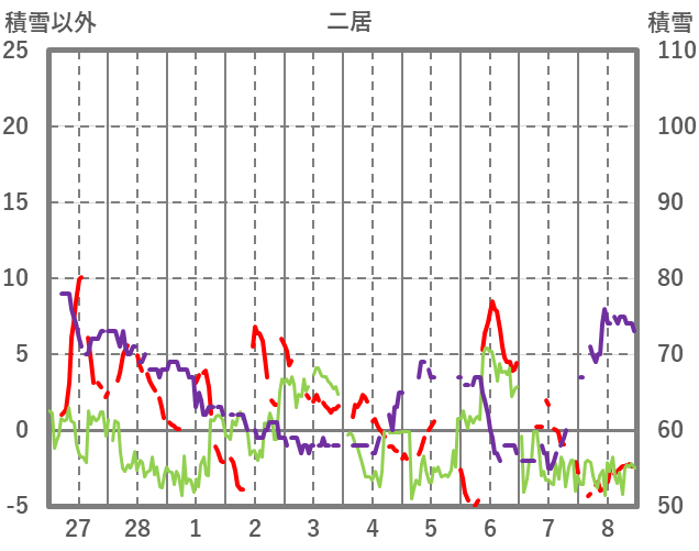 | 日 | 時 | 気温 | 降水 | 風向/風速 | 日照 | 積雪 | 降雪 |