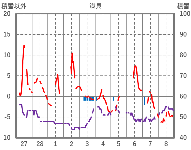 | 日 | 時 | 気温 | 降水 | 風向/風速 | 日照 | 積雪 | 降雪 |