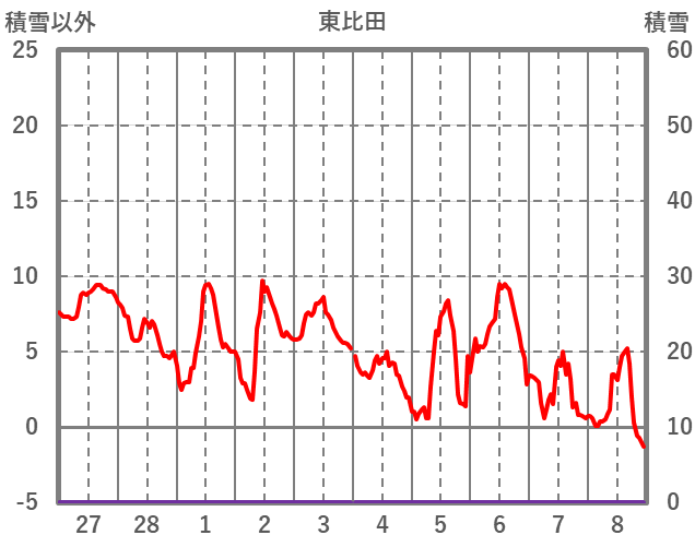 | 日 | 時 | 気温 | 降水 | 風向/風速 | 日照 | 積雪 | 降雪 |
