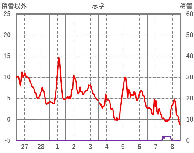 | 日 | 時 | 気温 | 降水 | 風向/風速 | 日照 | 積雪 | 降雪 |