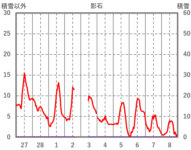 | 日 | 時 | 気温 | 降水 | 風向/風速 | 日照 | 積雪 | 降雪 |