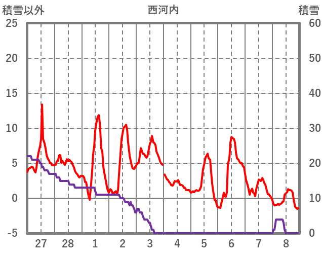 | 日 | 時 | 気温 | 降水 | 風向/風速 | 日照 | 積雪 | 降雪 |