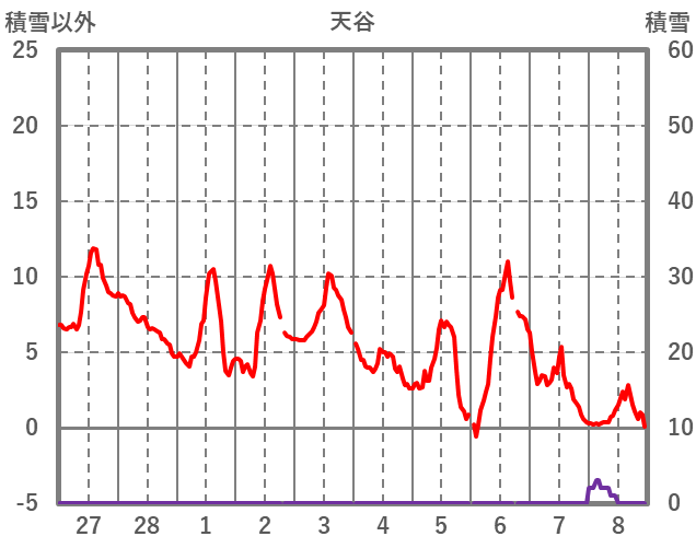 | 日 | 時 | 気温 | 降水 | 風向/風速 | 日照 | 積雪 | 降雪 |