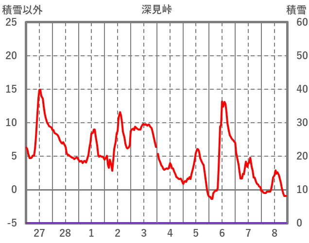 | 日 | 時 | 気温 | 降水 | 風向/風速 | 日照 | 積雪 | 降雪 |
