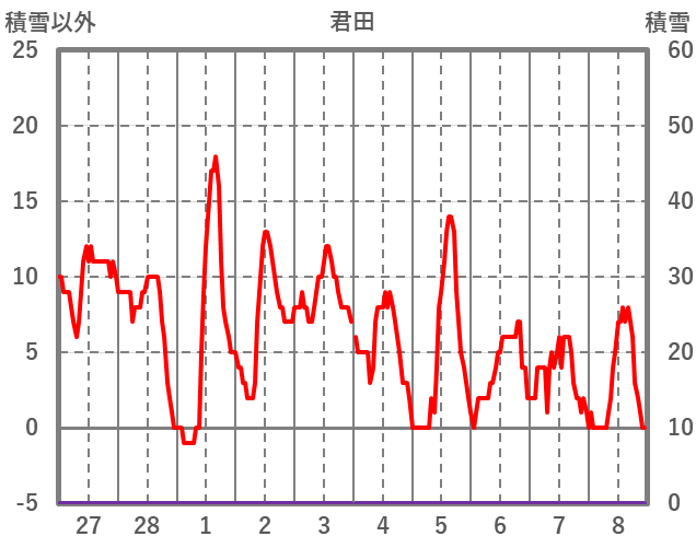 | 日 | 時 | 気温 | 降水 | 風向/風速 | 日照 | 積雪 | 降雪 |