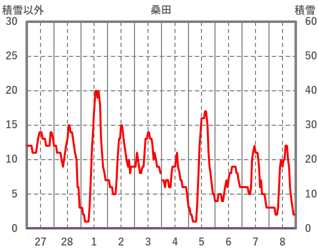 | 日 | 時 | 気温 | 降水 | 風向/風速 | 日照 | 積雪 | 降雪 |