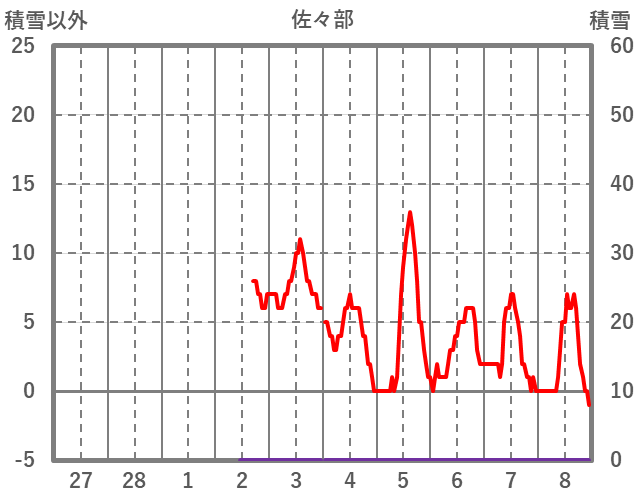 | 日 | 時 | 気温 | 降水 | 風向/風速 | 日照 | 積雪 | 降雪 |