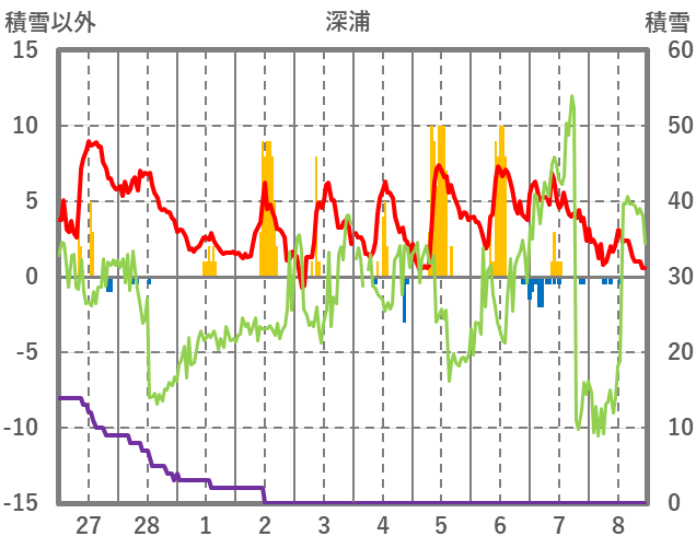 | 日 | 時 | 気温 | 降水 | 風向/風速 | 日照 | 積雪 | 降雪 |