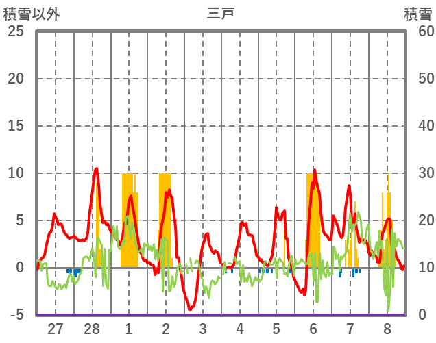 | 日 | 時 | 気温 | 降水 | 風向/風速 | 日照 | 積雪 | 降雪 |