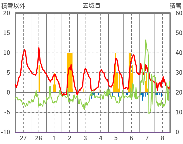 | 日 | 時 | 気温 | 降水 | 風向/風速 | 日照 | 積雪 | 降雪 |
