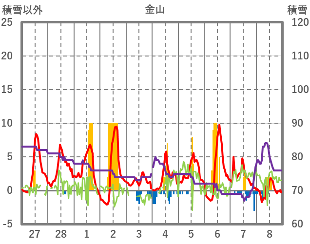 | 日 | 時 | 気温 | 降水 | 風向/風速 | 日照 | 積雪 | 降雪 |