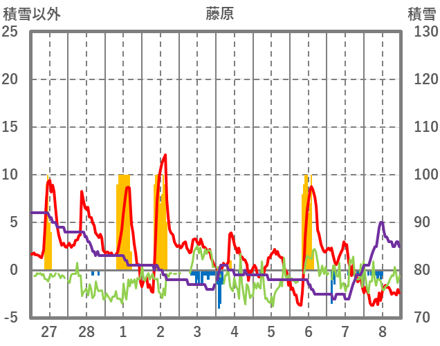 | 日 | 時 | 気温 | 降水 | 風向/風速 | 日照 | 積雪 | 降雪 |