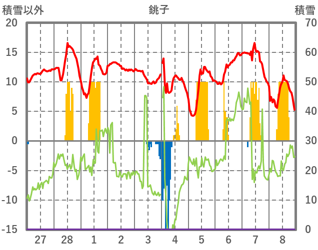 | 日 | 時 | 気温 | 降水 | 風向/風速 | 日照 | 積雪 | 降雪 |