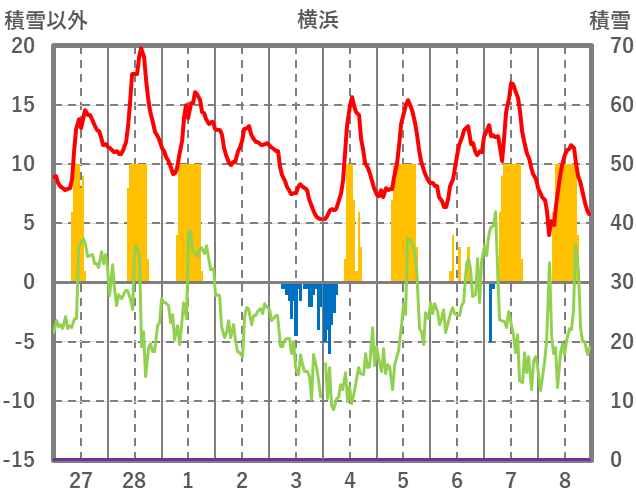 | 日 | 時 | 気温 | 降水 | 風向/風速 | 日照 | 積雪 | 降雪 |