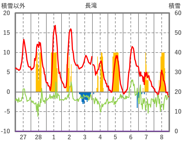 | 日 | 時 | 気温 | 降水 | 風向/風速 | 日照 | 積雪 | 降雪 |