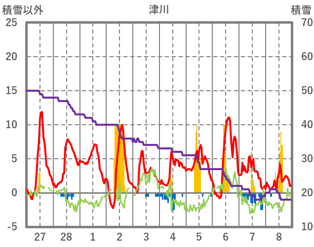 | 日 | 時 | 気温 | 降水 | 風向/風速 | 日照 | 積雪 | 降雪 |