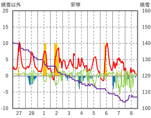 | 日 | 時 | 気温 | 降水 | 風向/風速 | 日照 | 積雪 | 降雪 |