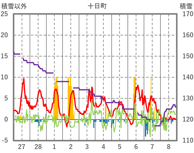 | 日 | 時 | 気温 | 降水 | 風向/風速 | 日照 | 積雪 | 降雪 |