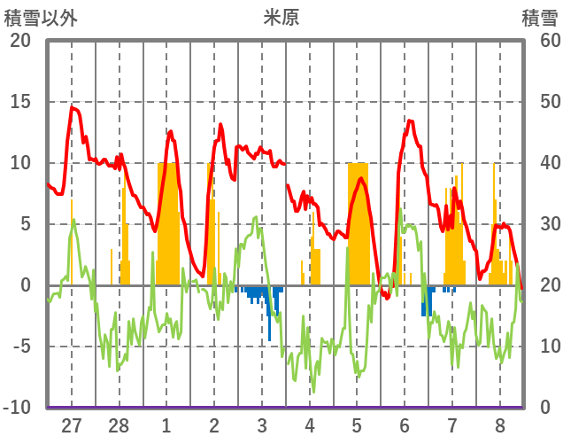| 日 | 時 | 気温 | 降水 | 風向/風速 | 日照 | 積雪 | 降雪 |
