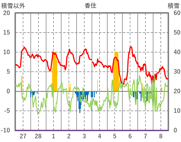 | 日 | 時 | 気温 | 降水 | 風向/風速 | 日照 | 積雪 | 降雪 |