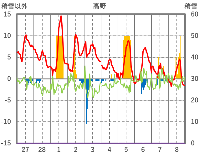 | 日 | 時 | 気温 | 降水 | 風向/風速 | 日照 | 積雪 | 降雪 |