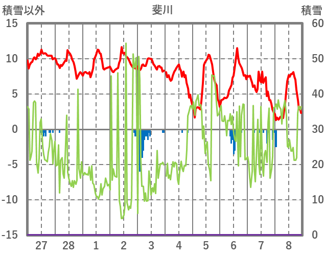 | 日 | 時 | 気温 | 降水 | 風向/風速 | 日照 | 積雪 | 降雪 |