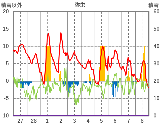 | 日 | 時 | 気温 | 降水 | 風向/風速 | 日照 | 積雪 | 降雪 |