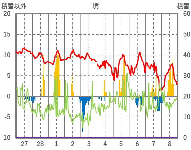 | 日 | 時 | 気温 | 降水 | 風向/風速 | 日照 | 積雪 | 降雪 |