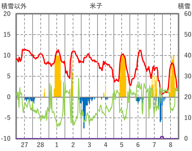| 日 | 時 | 気温 | 降水 | 風向/風速 | 日照 | 積雪 | 降雪 |