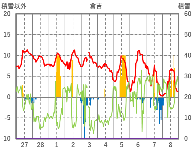 | 日 | 時 | 気温 | 降水 | 風向/風速 | 日照 | 積雪 | 降雪 |