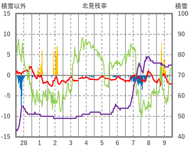 | 日 | 時 | 気温 | 降水 | 風向/風速 | 日照 | 積雪 | 降雪 |
