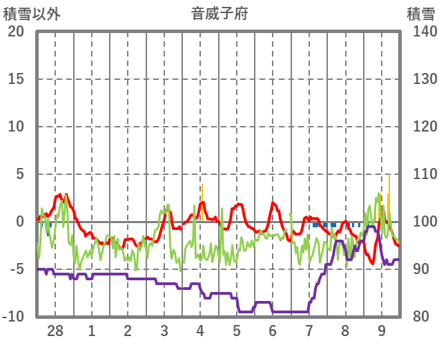 | 日 | 時 | 気温 | 降水 | 風向/風速 | 日照 | 積雪 | 降雪 |