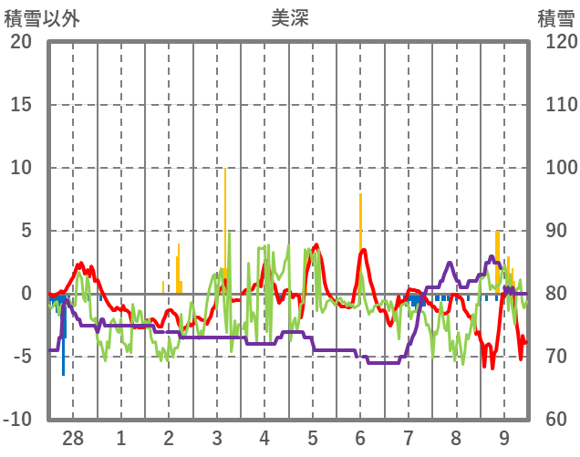 | 日 | 時 | 気温 | 降水 | 風向/風速 | 日照 | 積雪 | 降雪 |