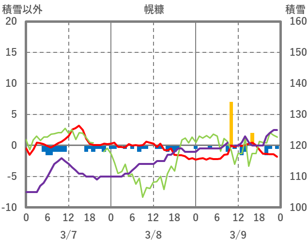 | 日 | 時 | 気温 | 降水 | 風向/風速 | 日照 | 積雪 | 降雪 |