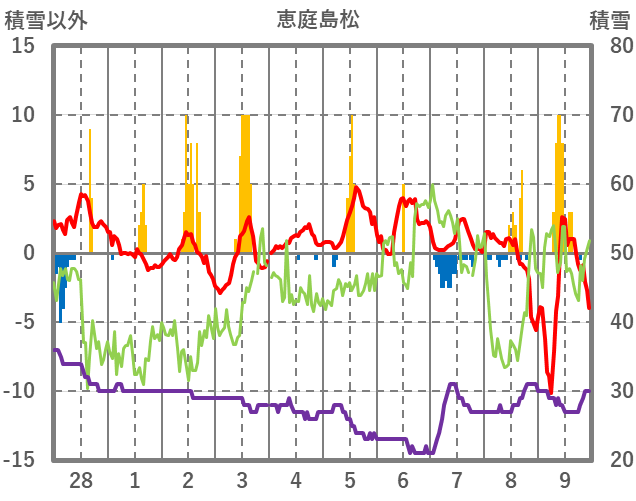 | 日 | 時 | 気温 | 降水 | 風向/風速 | 日照 | 積雪 | 降雪 |