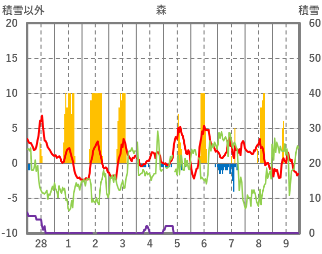 | 日 | 時 | 気温 | 降水 | 風向/風速 | 日照 | 積雪 | 降雪 |