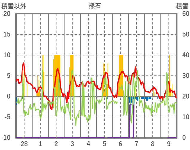 | 日 | 時 | 気温 | 降水 | 風向/風速 | 日照 | 積雪 | 降雪 |