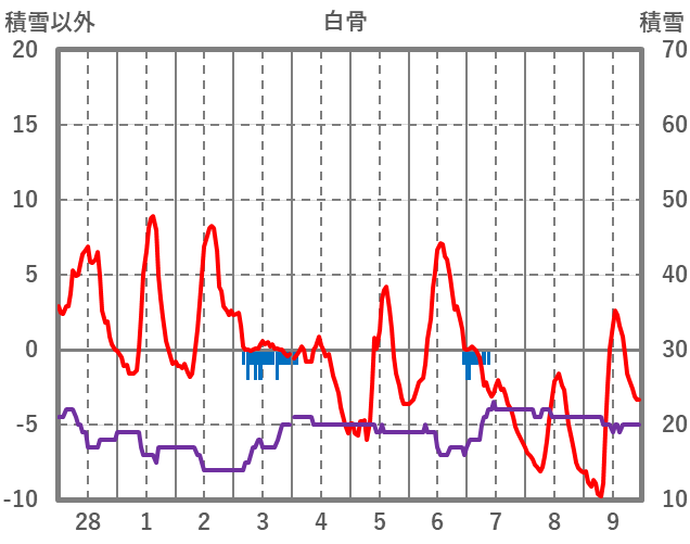 | 日 | 時 | 気温 | 降水 | 風向/風速 | 日照 | 積雪 | 降雪 |