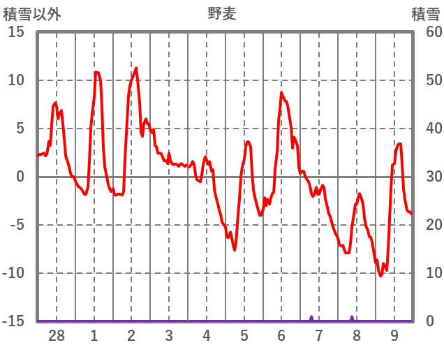 | 日 | 時 | 気温 | 降水 | 風向/風速 | 日照 | 積雪 | 降雪 |