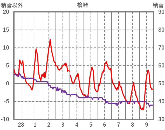 | 日 | 時 | 気温 | 降水 | 風向/風速 | 日照 | 積雪 | 降雪 |